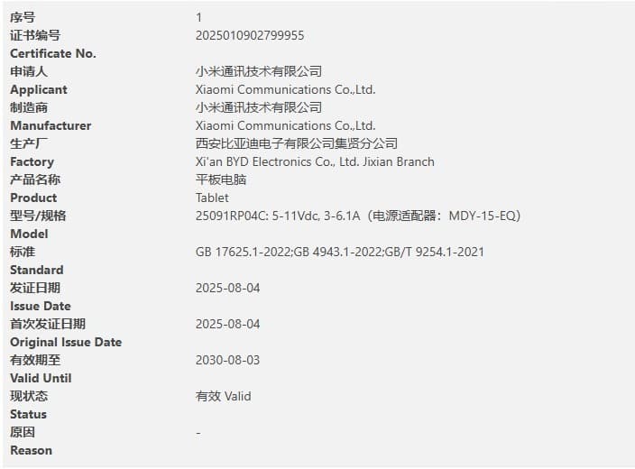 In addition, the 25097RP43C and 25091RP04C tablets have also passed the 3C certification. Among them, the 25097RP43C is equipped with the MDY-17-EE charger and supports 45W charging. The 25091RP04C is equipped with the MDY-15-EQ charger and supports 67W fast charging, suggesting that it should belong to the REDMI series.
