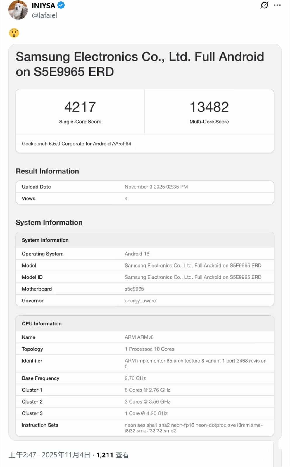 Igeekphone News, November 4th: Today, netizen @lafaiel posted a tweet on the X platform, sharing a screenshot of the GeekBench 6.5.0 version benchmark score, showing the engineering sample score of the Samsung Exynos 2600 flagship chip, with a single-core score of 4217 points. The multi-core score is 13,482 points.