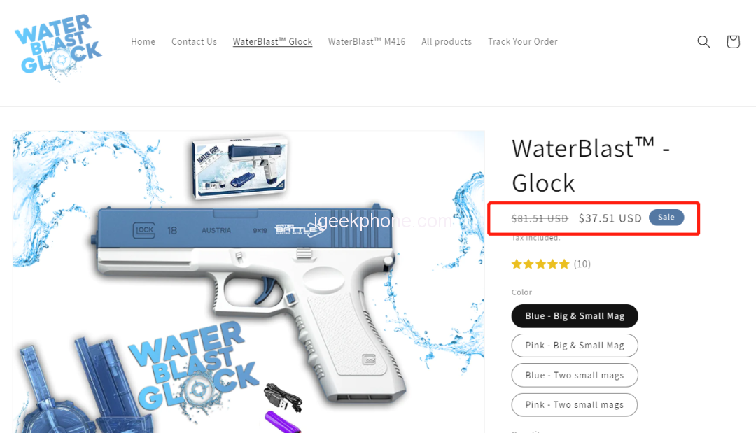 The water gun product, known as WaterBlast Glock, is an electric water gun powered by batteries. It offers a long range and precision and comes with magazines for extended gameplay. The product is available in blue and pink colors, priced at $37.51. User reviews on the product webpage have been positive, with all ratings giving it 5 stars.