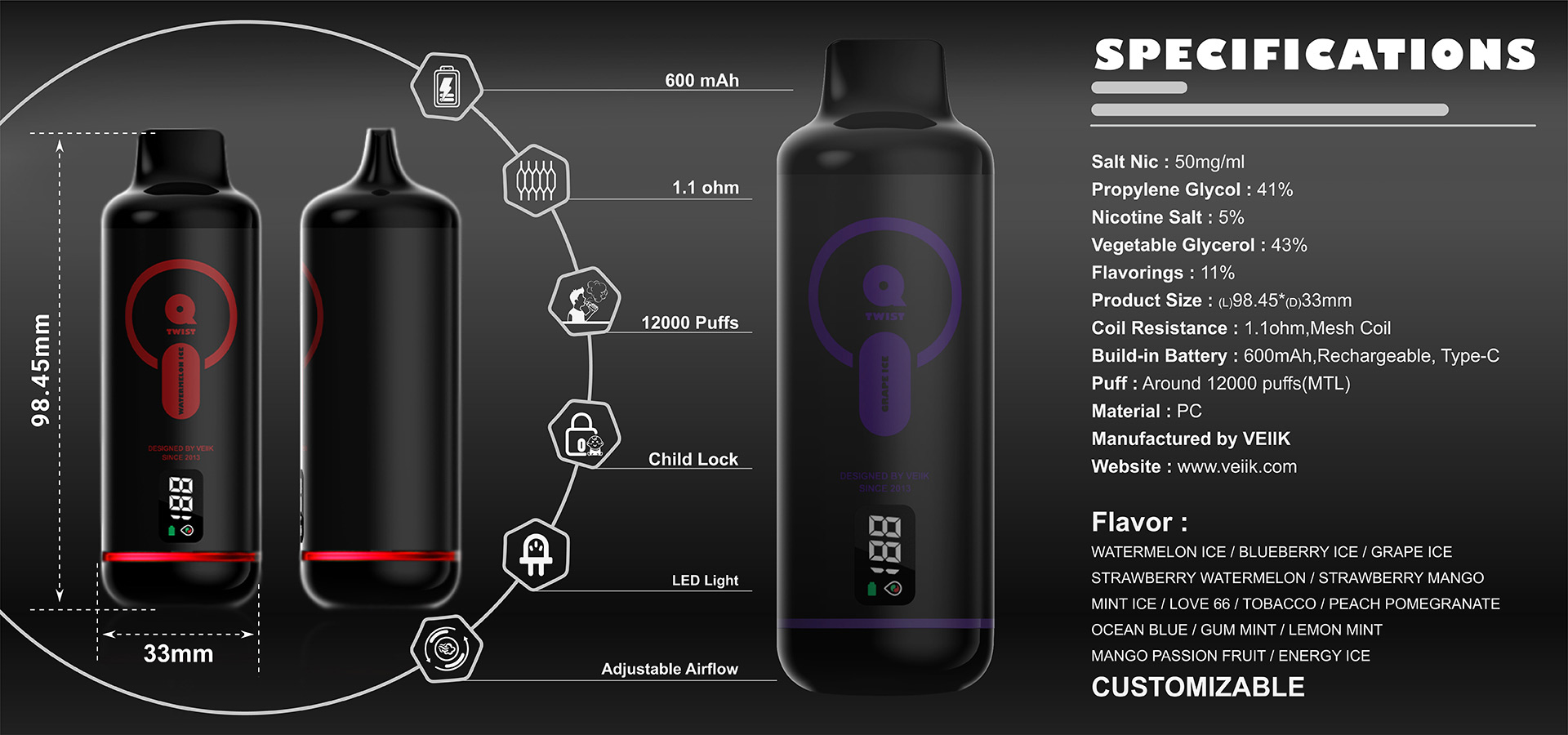 The Micko Q Twist combines design aesthetics with functionality, featuring a display at L98.5*D33mm. It stands out with a unique twist – adjustable voltage and wattage, offering users a more versatile vaping experience. The device is non-mechanical and caters to users above 18, with a puff count of 12000.