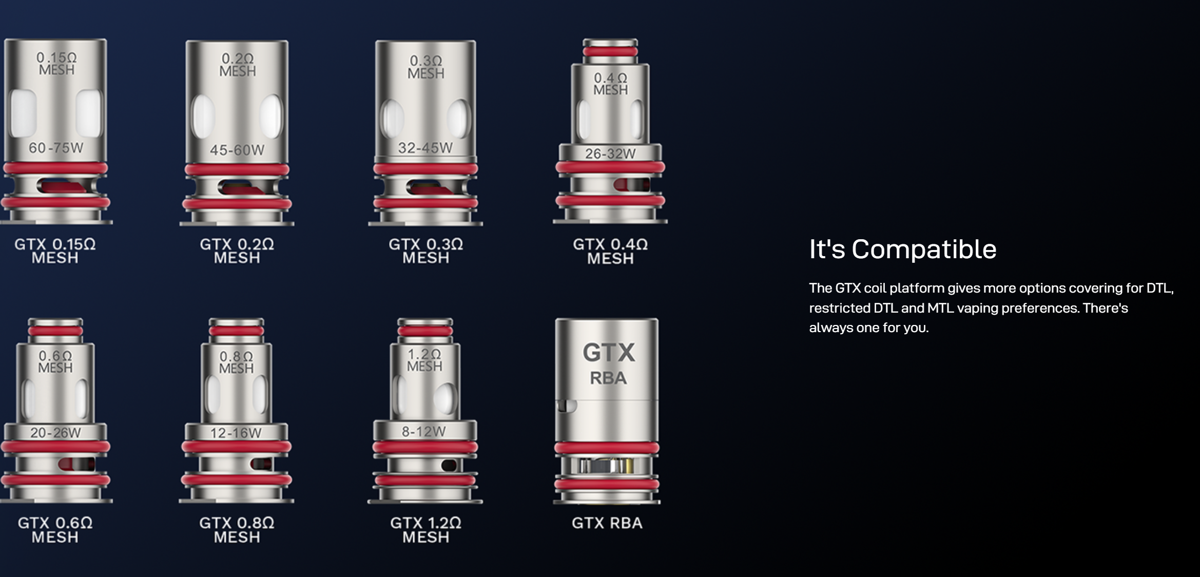 - Power and Flavor: The GTX coil platform offers various coil options, including DTL, restricted DTL, and MTL, ensuring compatibility with a wide range of devices and vaping preferences.