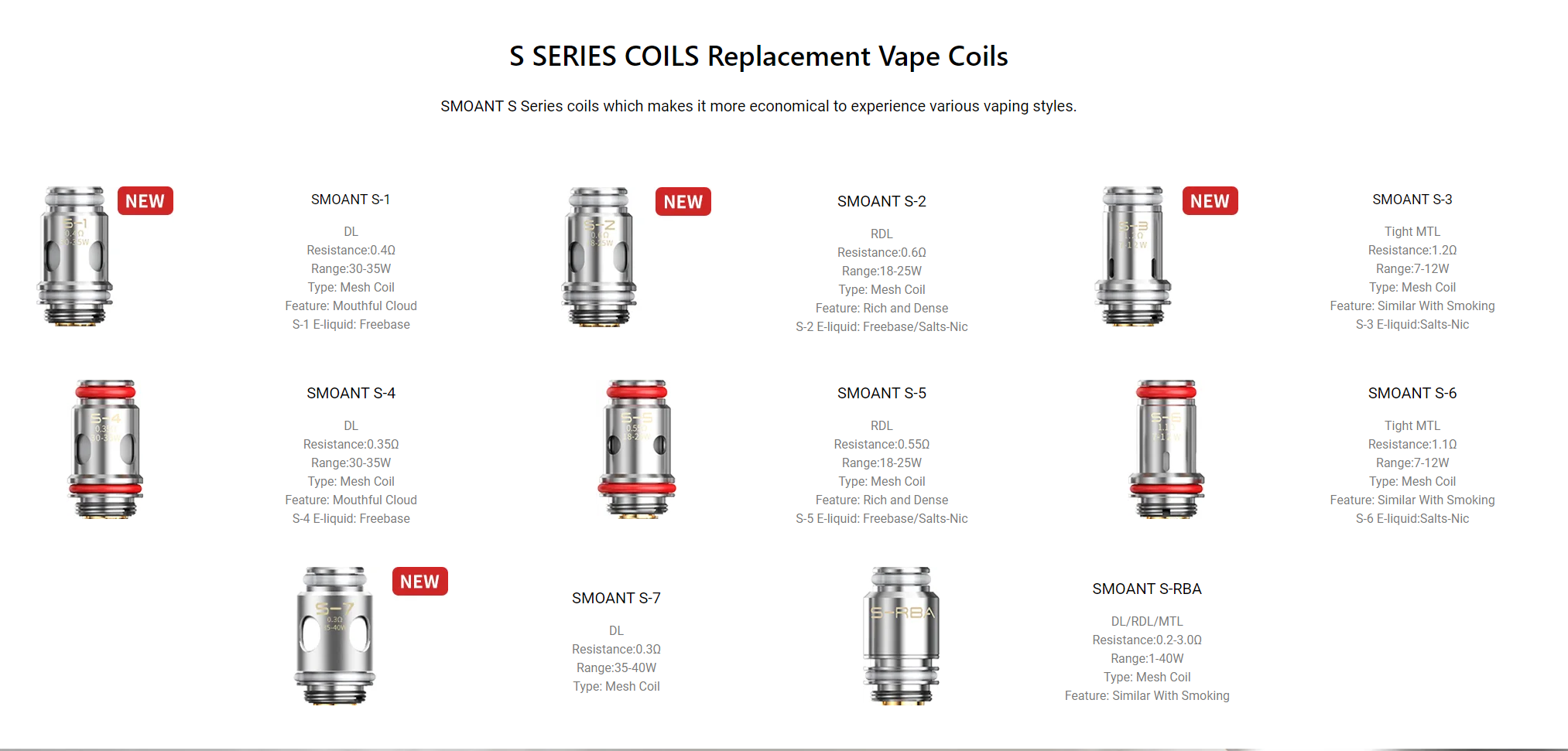 - S-4 to S-6: Similar to their counterparts but with slight variations in resistance and wattage range, offering flexibility for different vaping preferences.