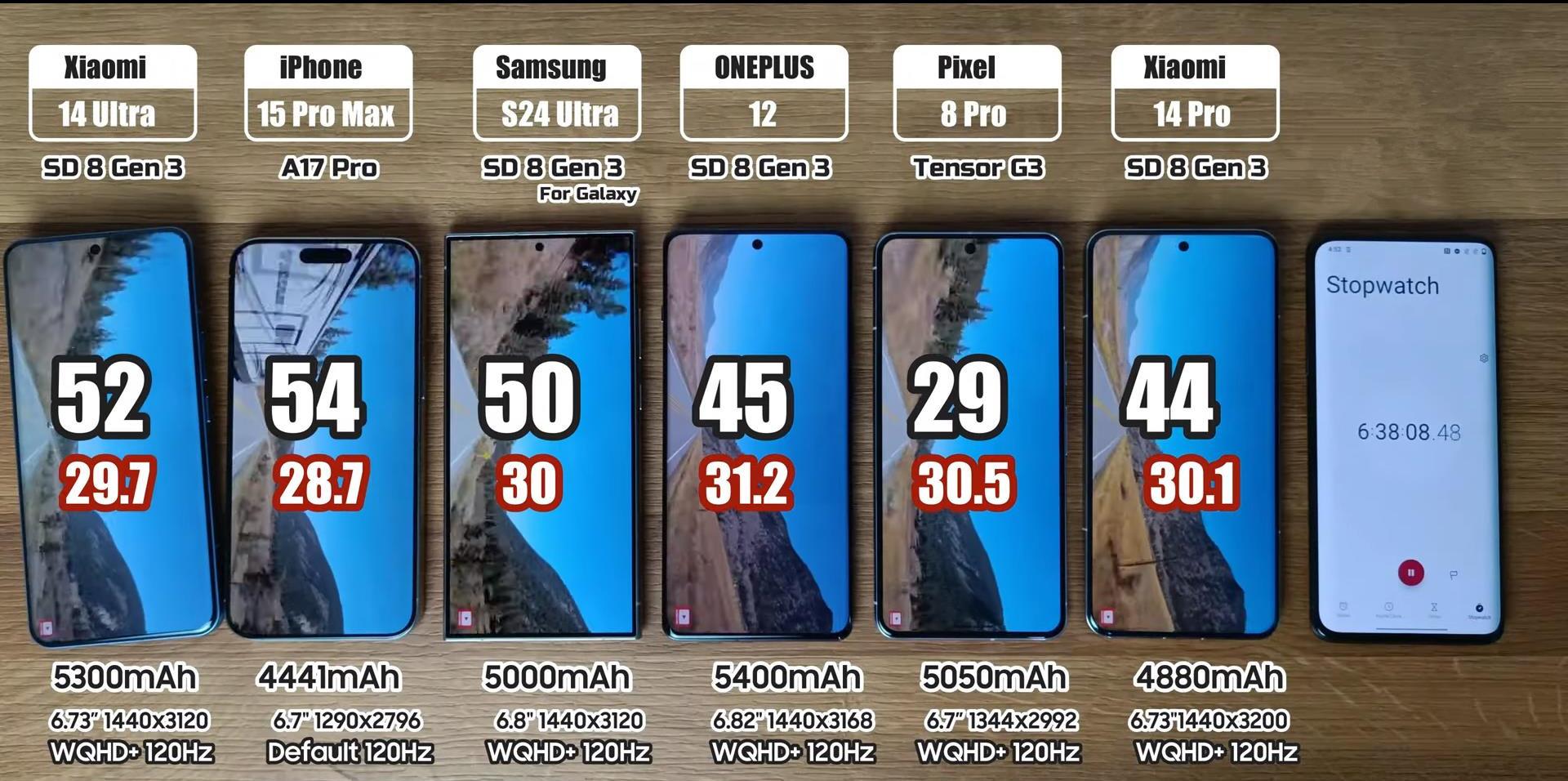 After 6 hours and 38 minutes of battery life, the battery power percentage of the six mobile phones, Xiaomi 14Ultra, iPhone15ProMax, Samsung S24Ultra, One Plus 12, Google Pixel8Pro, Xiaomi 14Pro, is 52%, 54%, 50%, 45%, 29%, 44%, respectively. The iPhone15ProMax is still ranked first, and the Google Pixel8Pro is ranked bottom for the time being.