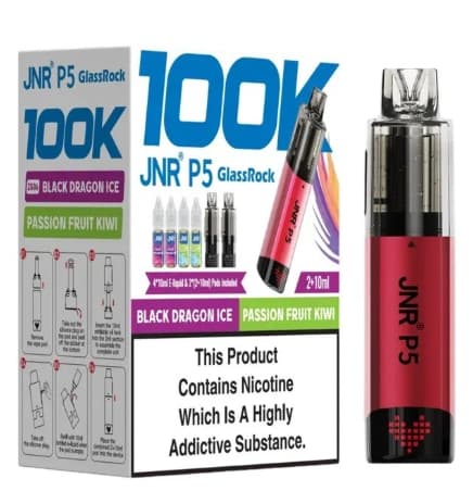 JNR P5 GlassRock 100K Disposable Vape redefines the term “disposable” with an innovative hybrid design. It is marketed as the world’s first disposable pod capable of delivering up to 100,000 puffs, achieved by including a massive total of 64ml of e-liquid. This comes as two pre-filled 10ml refillable pods in different flavors, plus four additional 10ml bottles for refilling. Powered by a 1000mAh rechargeable battery and featuring a smart screen, it utilizes a 1.2Ω dual mesh coil for enhanced flavor and vapor production. This unique setup offers an exceptionally long-lasting experience far beyond typical single-use devices.