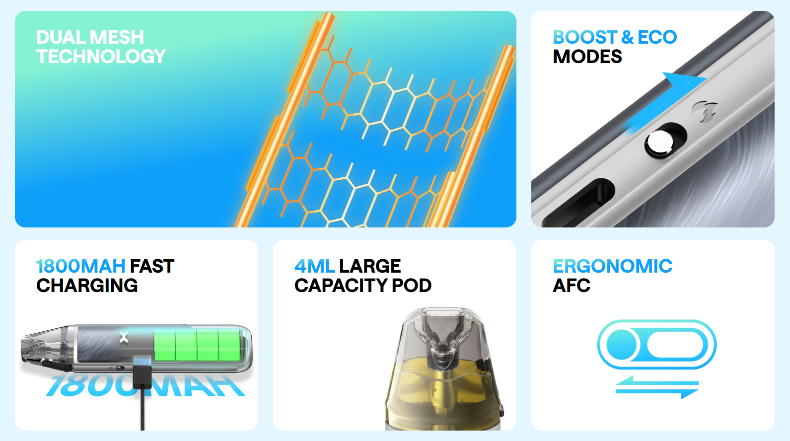 From its Dual Mesh flavor system to Dual Modes, fast charging, and long-lasting pods, every feature feels intentional and refined. For new users, it’s the ideal gateway into premium vaping without any complexity. For experienced ones, it’s a surprisingly capable pocket-sized performer.