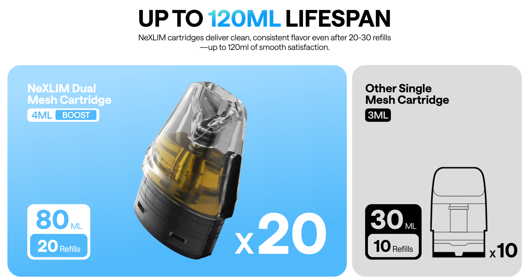 The true heart of the NeXLIM GO lies in its Dual Mesh Technology, which directly addresses the limitations of single-mesh systems. By expanding the heating surface area, it enhances vapor density, boosts flavor consistency, and doubles cartridge lifespan — up to 120ml of clean, rich flavor before replacement.