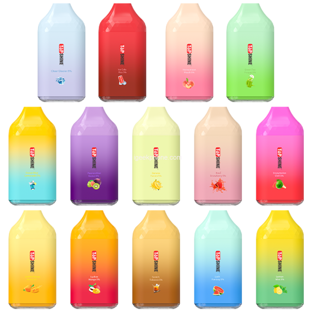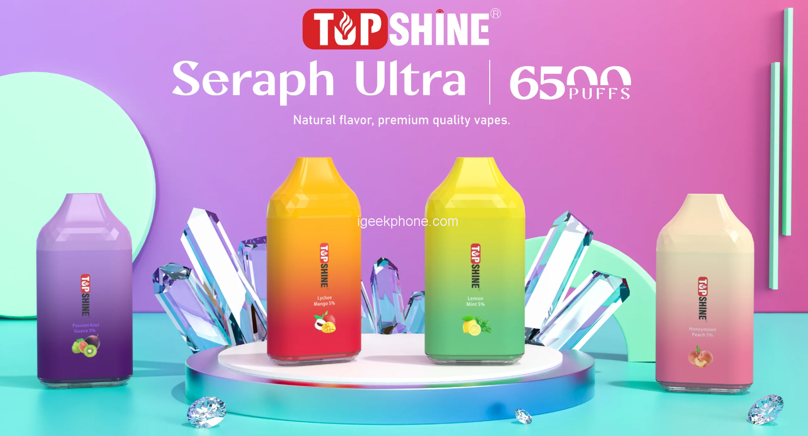 Top Shine Seraph Ultra comes in a wide range of refreshing flavors. These flavors include Green Tea Frappe, Honeymoon Peach, Ice Cola Fizz, Jumbo Mango Breeze, Lemon Mint, Lush Fantasy, Lychee Mango, Ocean Blue Lemonade, Passion Kiwi Guava, Rose Strawberry, and Straw melon Chill.