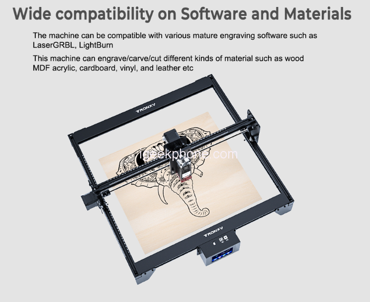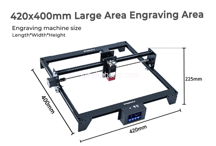 The TRONXY Marker 40 Laser Engraver is compatible with various mature engraving software such as LaserGRBL and LightBurn. The device supports Windows 7/8/10 and Linux systems and can support input formats such as NC, BMP, JPG, PNG, DXF, and more. The device’s large engraving area measures 420 x 400mm, enabling the machine to carve various materials such as wood, plastic, paper, bamboo, ox horn, leather, sponge paper, PCB board, aluminum oxide, non-reflective plating, and varnished metal. The device can also cut paper, wood, cloth, and leather. The upgraded 5.5W fixed-focus compress laser eliminates the need to manually focus before carving and can cut 2-3mm wood board.