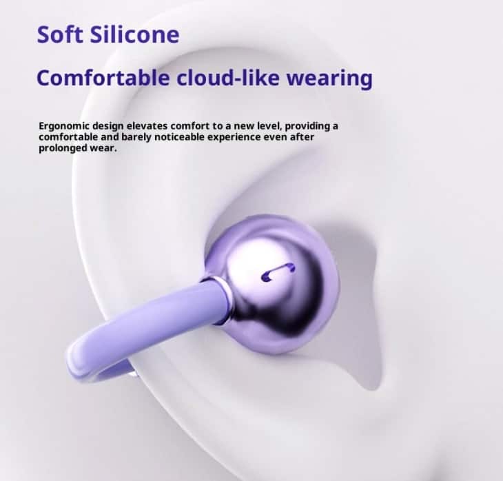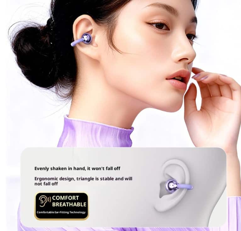Instead of conventional in-ear buds, the TS63 uses earclip-style hooks with flexible silicone material for comfort and stability — especially useful for sports or active movement. This open-ear sports design ensures a secure fit without ear fatigue over long durations.