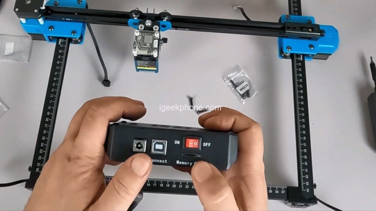 You will see in the video the motherboard of the laser printer. It adopts a 32-bit dual-core MCU. This gives to the printer faster processing speed. You can also connect with TF card or by using the WiFi ability that has. The 5.5W diode laser engraver as I told you comes with LD+FAC tech which gives 0.8 x 0.8mm laser focus. With the help of the dual motor for Y-axis, it is sure to have smooth and fast movement. The printer comes with a magnetic cover that can protect your eyes from harmful lights and stop the generated smoke from staining your laser diode. Use the knob switch on the laser module in order to adjust the focus. Don’t forget to check it every time before you start engraving.