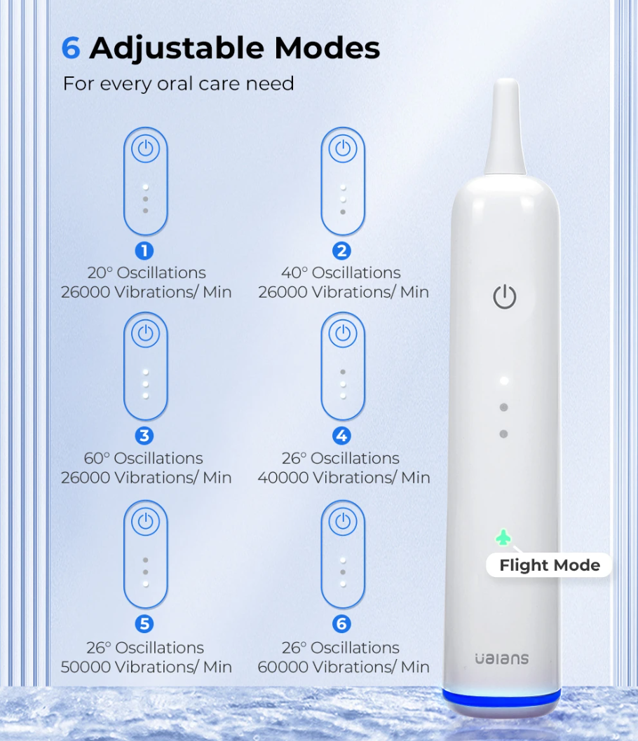 • Versatile Cleaning Modes: The toothbrush offers six adjustable modes that cater to various dental needs, from gentle cleaning to intense plaque removal. It also includes a flight mode, making it ideal for frequent travelers.