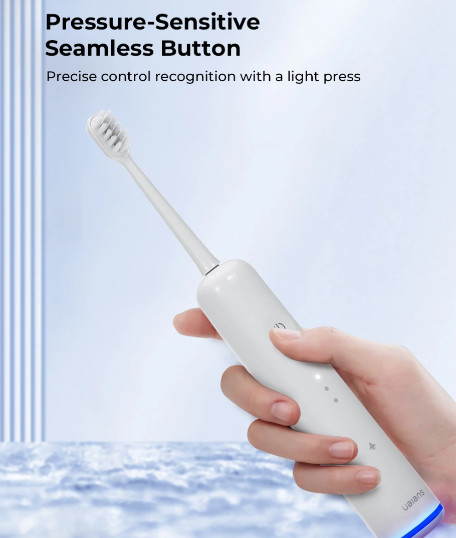 The Ualans YS01 boasts a sleek and modern design, with an emphasis on both aesthetics and functionality. Its pressure-sensitive touch control adds a clean, minimalistic look, eliminating the need for traditional buttons. This ensures hygienic use by reducing dirt accumulation, making it easier to clean. Its ergonomic body feels comfortable in the hand, and the IPX7 waterproof rating ensures it’s safe to use even in the shower, adding convenience to your daily routine. The toothbrush features a balanced brush head with metal weight balance technology, which minimizes noise and ensures a smoother brushing experience.