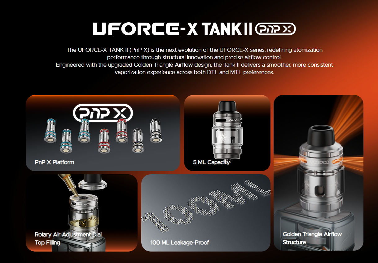 In conclusion, the UFORCE-X Tank II stands out as a powerful and versatile vape tank that blends innovation with practicality. Its advanced airflow system, durable PnP X coils, and user-friendly features make it an excellent choice for vapers seeking performance and reliability. Whether you’re chasing dense clouds or refined flavor, this tank delivers consistently across the board.