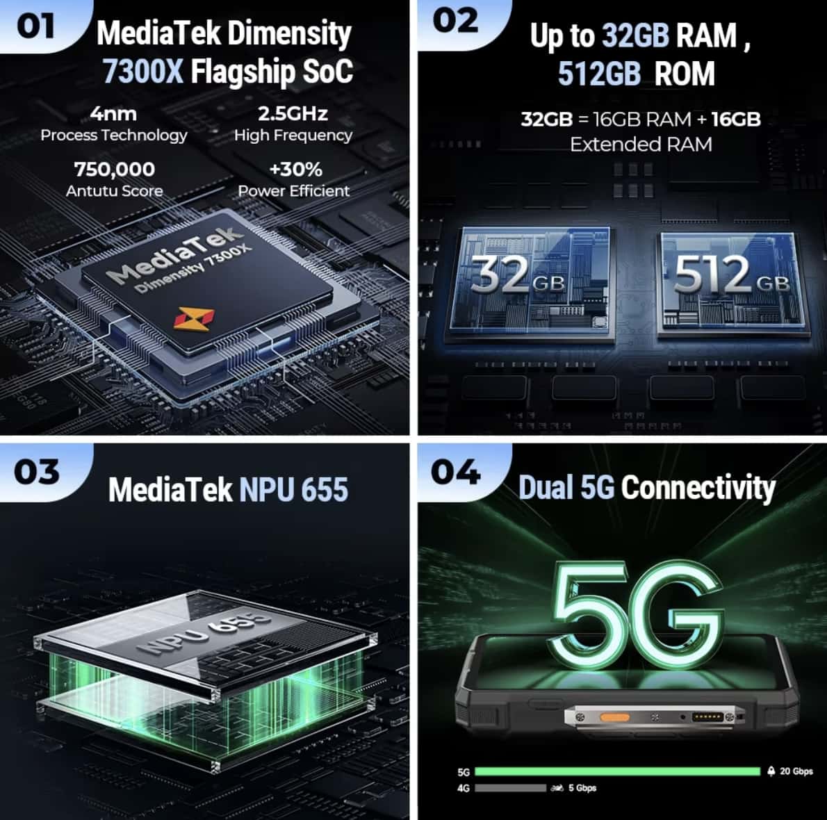 Under the hood, the Ulefone Armor 33 Pro is powered by the MediaTek Dimensity 7300X chipset. This octa-core processor delivers impressive performance for everything from gaming to multitasking, ensuring the phone runs smoothly even when handling demanding applications. Paired with 32GB of RAM and 512GB of internal storage, the phone offers ample space and power to keep your apps, photos, and files running efficiently.
