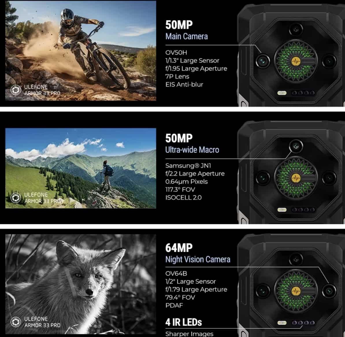 While rugged smartphones are typically more focused on durability, the Ulefone Armor 33 Pro doesn’t skimp on camera quality. Equipped with a 50MP triple camera setup, it offers excellent photo quality for a wide range of scenarios. The 64MP night vision camera is particularly notable, allowing users to capture clear images even in extremely low light conditions. Whether you’re capturing detailed close-ups, wide landscape shots, or nighttime scenes, this smartphone delivers great results.