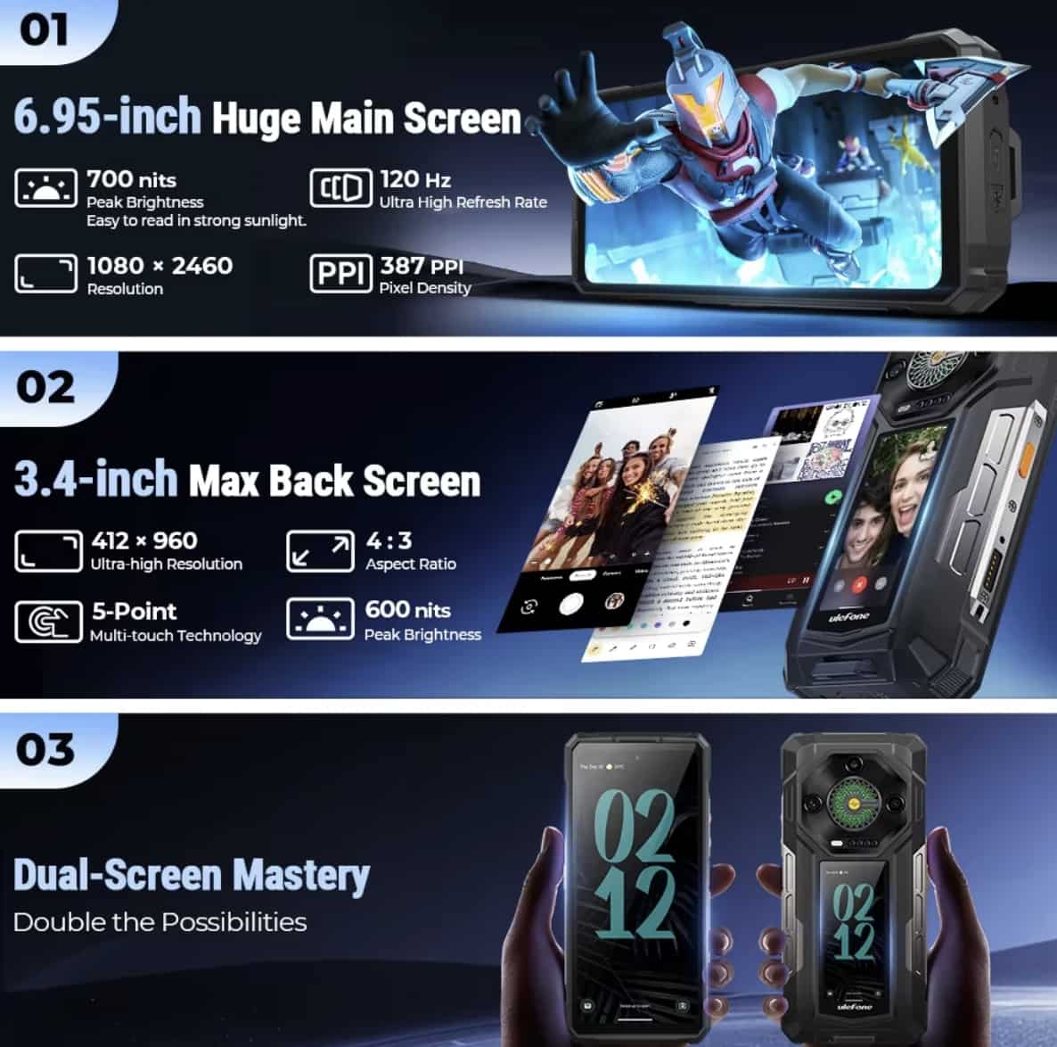 Another feature that sets the Ulefone Armor 33 Pro apart from other rugged smartphones is its dual display. The device features a 6.95-inch primary display with a 120Hz refresh rate, providing a smooth and immersive viewing experience for everything from gaming to media consumption. This large display ensures excellent visuals, whether you’re outdoors or indoors.