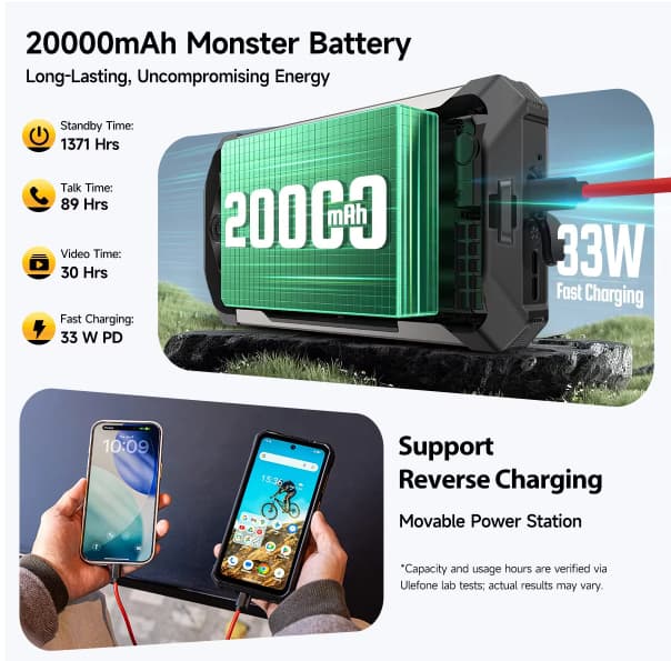 One of the standout features of the Ulefone Rugking 5 Pro is its 20,000mAh battery. This massive battery ensures long-lasting power, keeping you connected and productive throughout the day—whether you’re on a hike, working a shift, or traveling for hours. The 16,33W fast charging capability ensures that even when you do need to recharge, the process is quick and efficient, so you’re never left waiting for long.