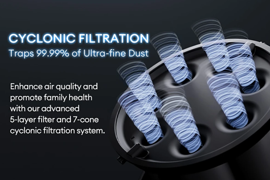 The vacuum’s 5-layer filtration system, including a 7-cone cyclonic filtration mechanism, ensures that 99.99% of ultra-fine dust is captured. This system not only cleans your floors but also improves indoor air quality, making it a great choice for households with allergies or respiratory sensitivities.