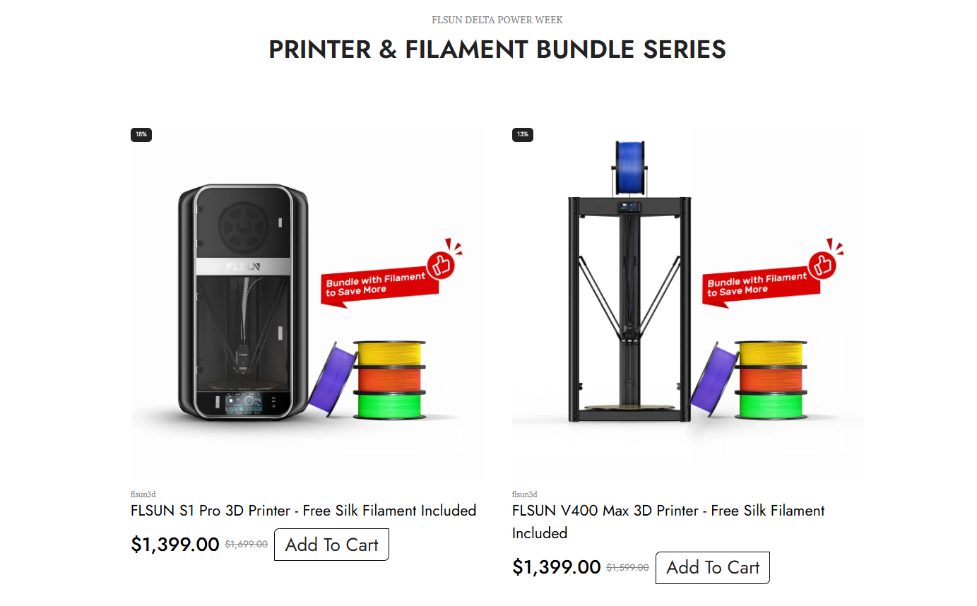 Why buy separately when you can save more? For example, the FLSUN S1 Pro + Free Silk Filament is just $1,499 (down from $1,699).