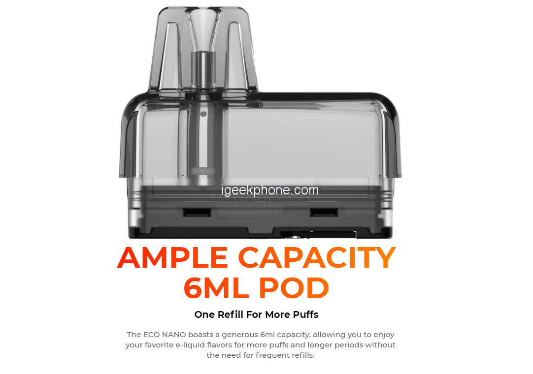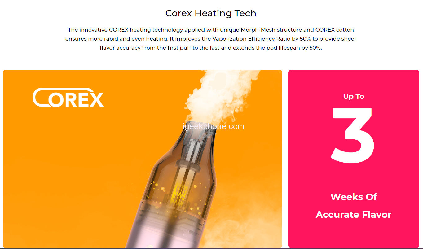 The Eco Nano impresses with its 6ml long-lasting pod capacity, allowing users to enjoy their favorite e-liquid flavors for an extended period without frequent refills. Its innovative COREX heating technology, featuring a unique Morph-Mesh structure and COREX cotton, ensures rapid and even heating for enhanced flavor accuracy. Additionally, this technology extends the pod’s lifespan by 50%, providing long-lasting performance.