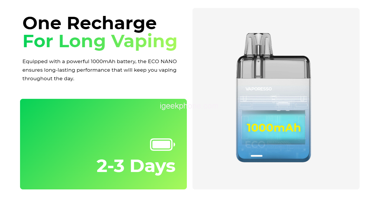 In conclusion, the Vaporasso Eco Nano and Vaporesso Veco Go Kit offer impressive features and performance. The Eco Nano excels in its larger pod capacity, allowing for more puffs and extended periods between refills. Its COREX heating technology ensures enhanced flavor accuracy and a longer pod lifespan. With its stylish pen-style design and vibrant color options, the Veco Go Kit provides simplicity without compromising performance. It offers a slightly larger battery capacity, allowing for extended usage time.