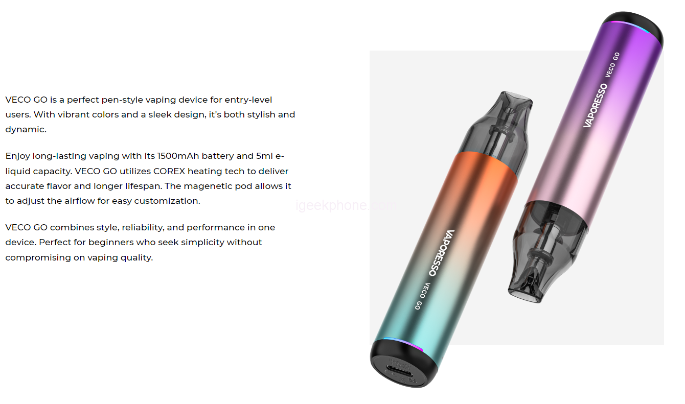 On the other hand, the Veco Go Kit offers a 5ml e-liquid capacity, which still allows for an enjoyable vaping experience without frequent refills. It also utilizes the COREX heating tech, ensuring precise flavor delivery and a longer pod lifespan.