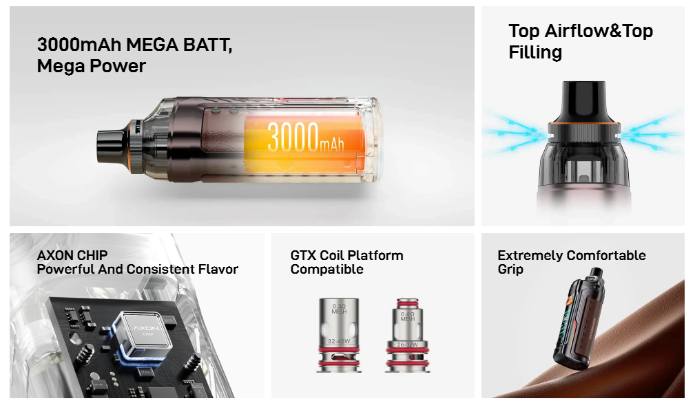 - Vaporesso ARMOUR G ❘ GS: This device offers a substantial 3000mAh internal battery with up to 80W output. The MEGA BATT technology keeps the power consistent from full to low, thanks to the Neo PULSE MODE and COREX technology, which amplifies the flavor and maintains output stability.