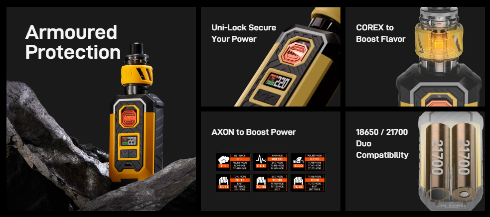 - ARMOUR MAX ❘ S: With dual 21700 battery compatibility, ARMOUR MAX boasts 54% more power than dual 18650 mods, making it ideal for heavy DTL vapers. It also offers a range of vaping modes, including PULSE, F[t], ECO, and various temperature control settings, courtesy of the AXON chip.