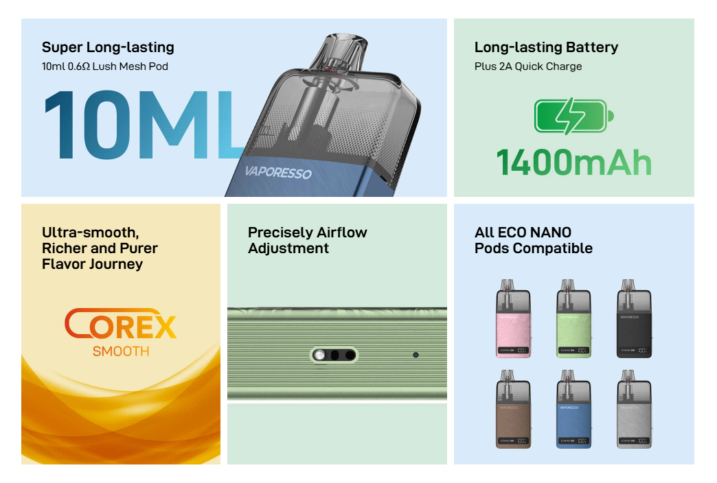 Its design focuses on utility, featuring a larger tank, a bigger battery, more puffs, and full compatibility with all Eco Nano pods.