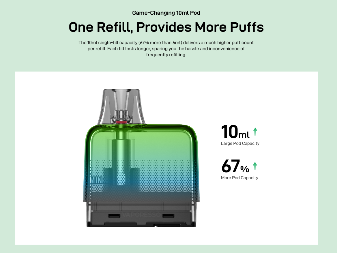 - Massive 10ml pod (67% larger than 6ml pods) ,fewer refills, more puffs