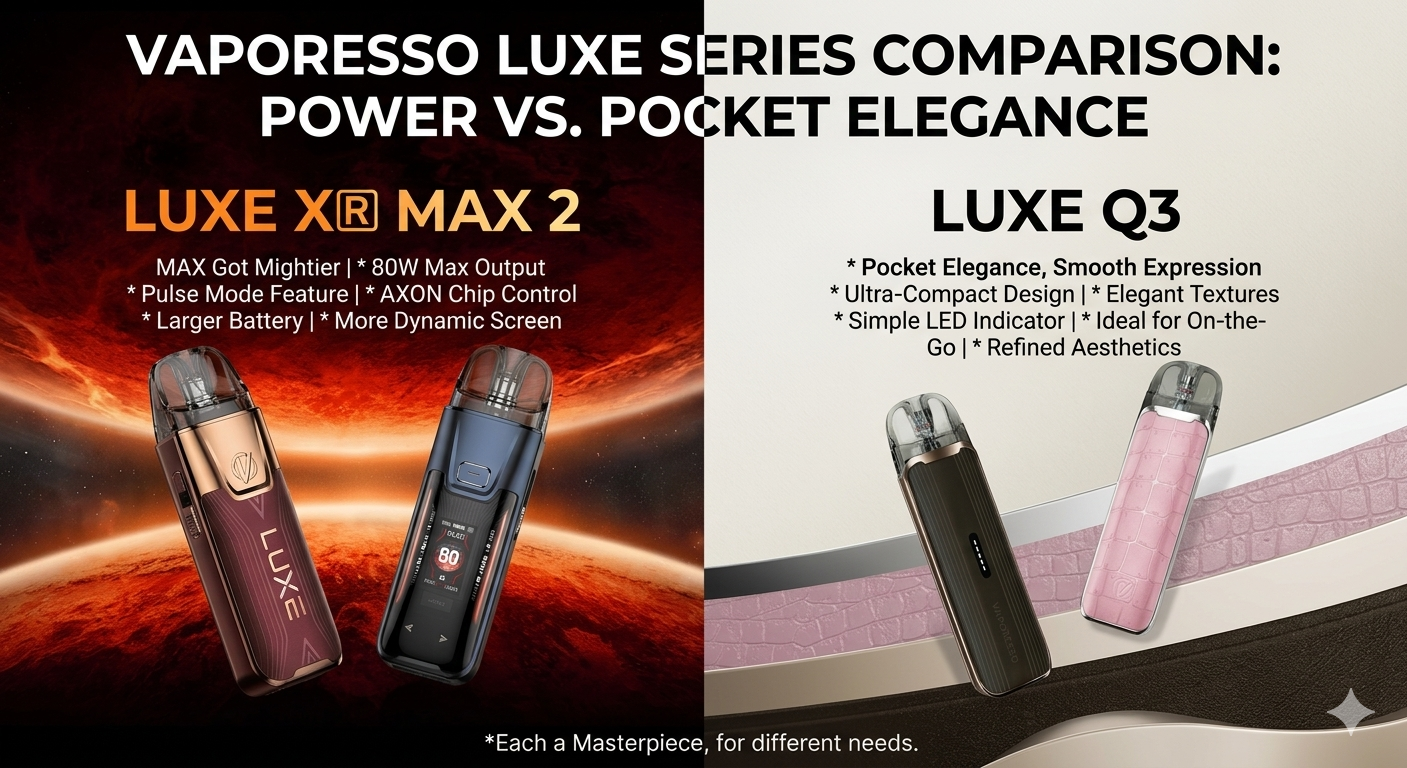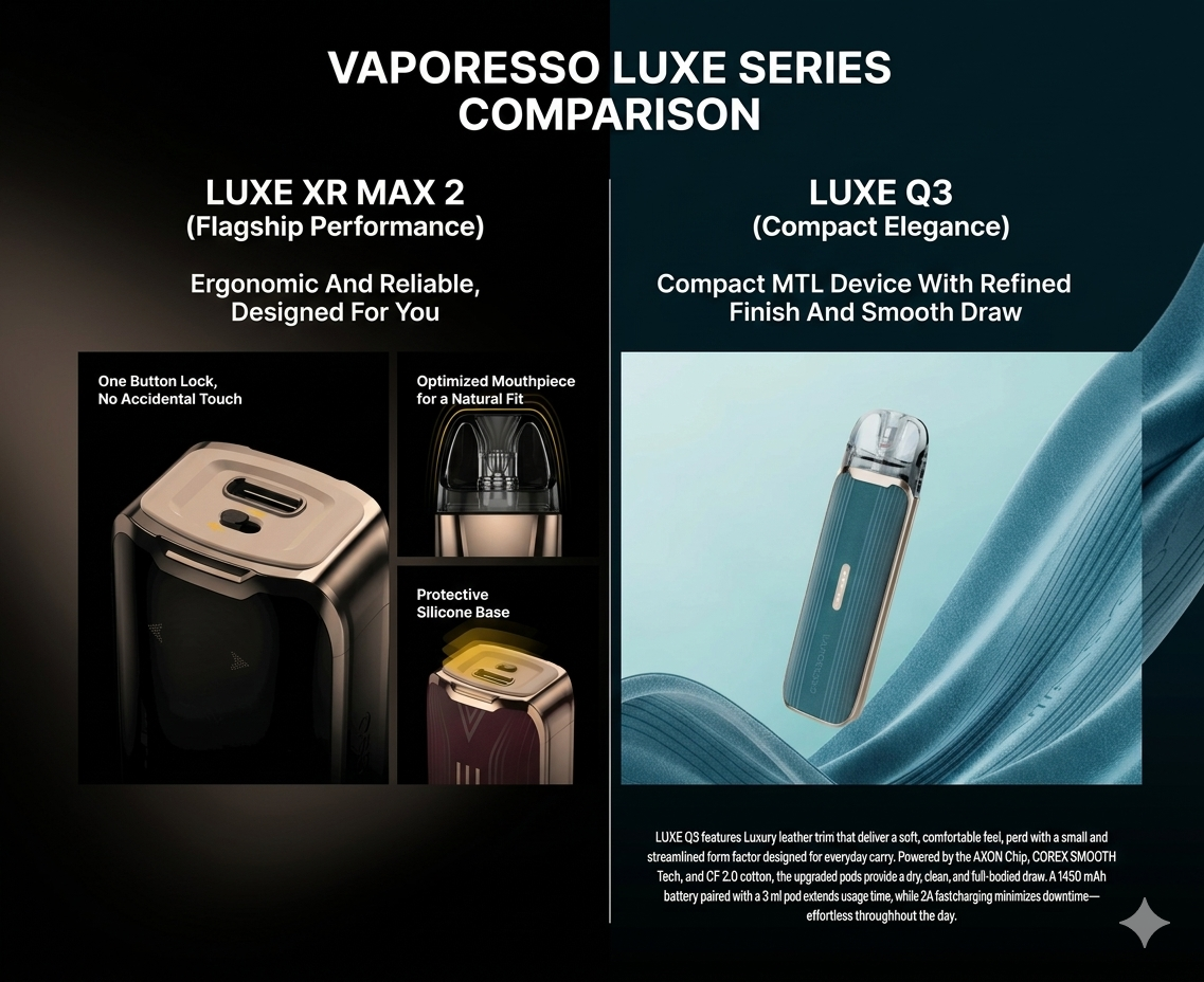 When choosing between the Vaporesso LUXE XR MAX 2 and the Vaporesso LUXE Q3, it really comes down to how you vape and what kind of experience you want. Both devices reflect Vaporesso’s latest design and technology upgrades, but they’re built for very different users. Here’s a clear, humanized comparison to help you decide.