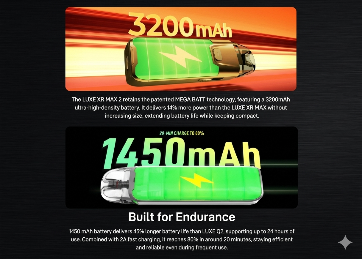 Meanwhile, the LUXE XR MAX 2 packs a massive 3200mAh battery. It’s built for extended sessions and higher wattage vaping without frequent charging. Despite its power, it still maintains efficient charging via USB-C.