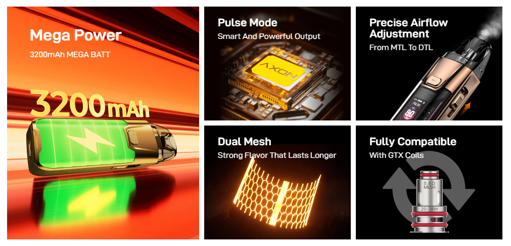 When it comes to power and customizability, the LUXE XR MAX 2 dominates. Powered by a 3200mAh MEGA BATT, it boasts the longest battery life in the LUXE family—14% more than its predecessor, and even more than most 80W pod mods on the market. It’s Pulse Mode, driven by the AXON Chip, ensures stable output and consistent flavor over long sessions. Combined with dual mesh GTX coil support, you’re looking at deep flavor, larger clouds, and exceptional coil longevity. Plus, the ability to switch from MTL to DTL through precise airflow control makes it ultra-versatile.