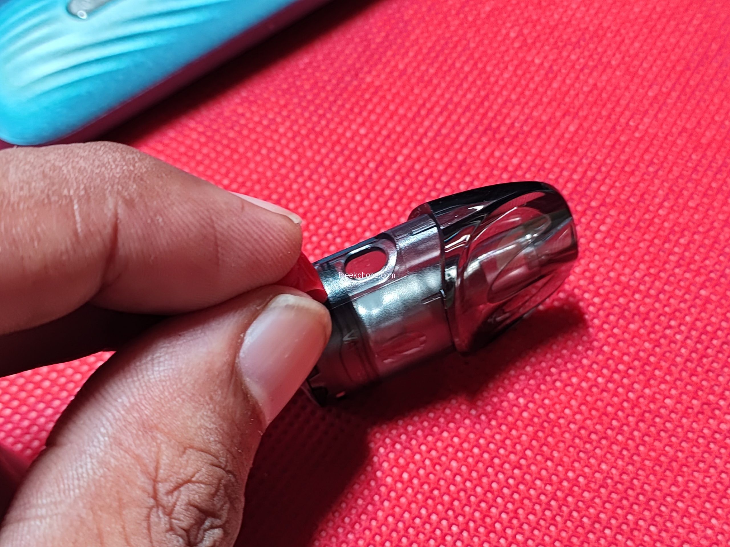 To refill the cartridge, it is necessary to remove it from the battery pack; open the silicone plug on the side surface, and pour 2 ml of liquid into the tank. You can use any liquid, both salt, and alkaline nicotine, but with a ratio of PG / VG 50/50.