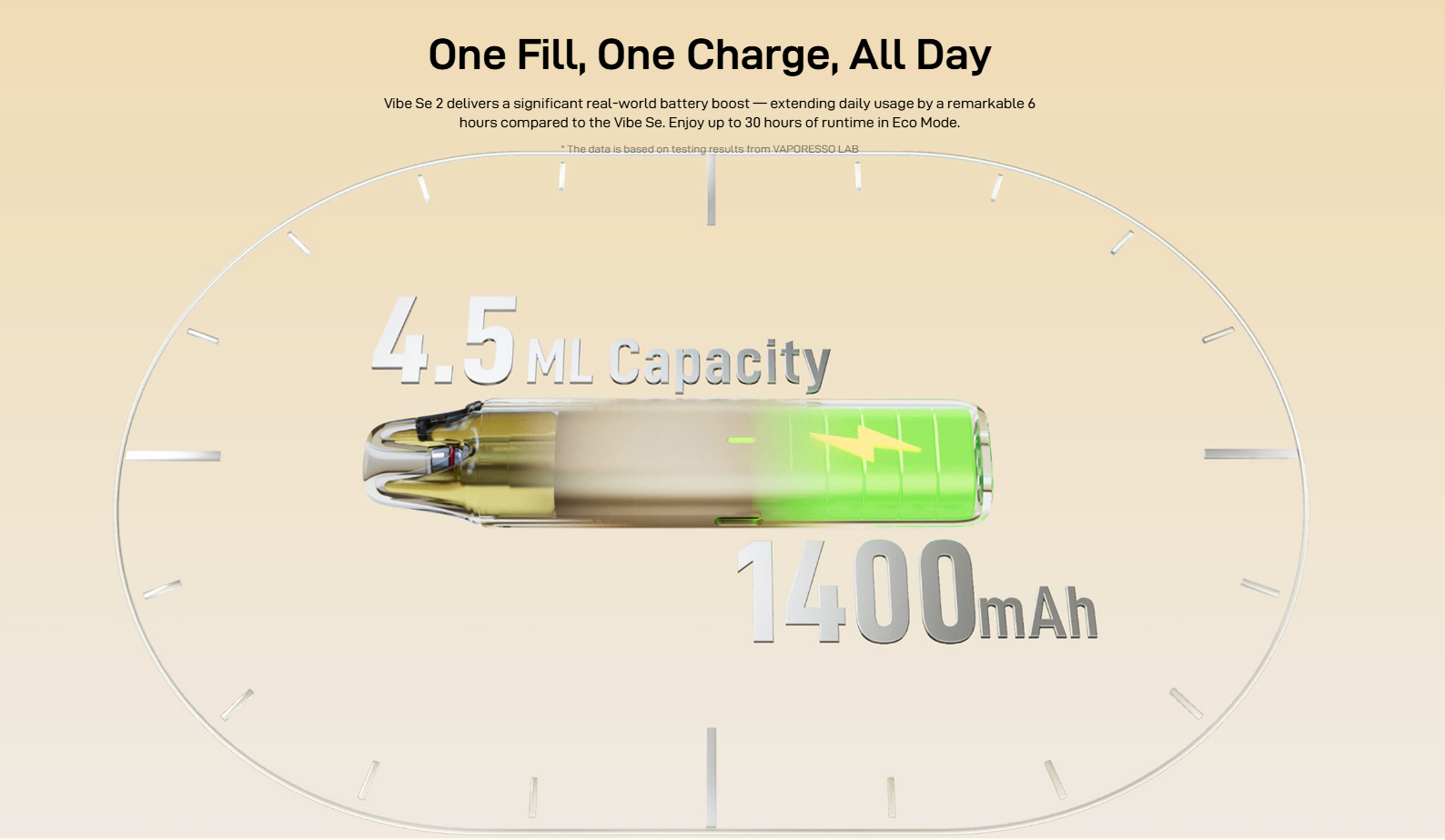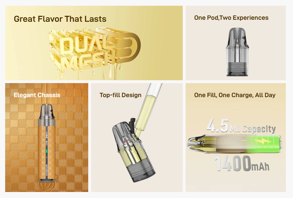 Battery life is a major win for the VIBE SE 2. With a 1,400mAh battery, it can last up to 30 hours in ECO mode, making it ideal for all-day use without frequent charging. The top-fill design also makes refilling quick and hassle-free.