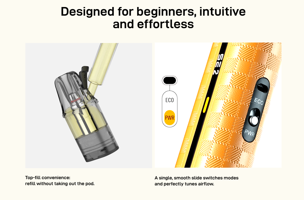 Both devices are beginner-friendly, but in different ways. The VIBE SE 2 uses a simple slide mechanism to switch modes and adjust airflow, making it intuitive without being overly basic.