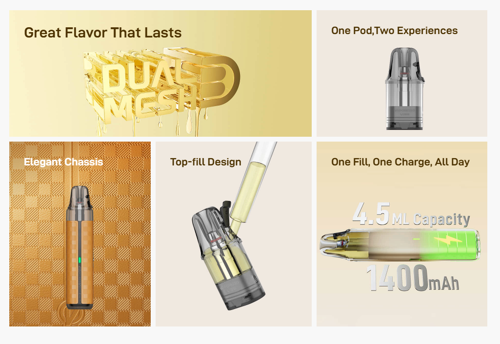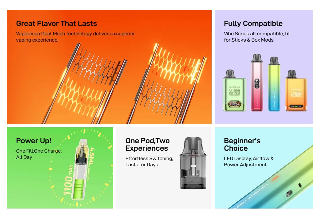 Performance is where the Vibe series truly shines. All three devices utilize Vaporesso’s Dual Mesh technology, which is engineered to produce smoother vapor and consistent flavor. This dual-mesh system helps distribute heat more evenly across the coil, enhancing both aroma intensity and vapor smoothness.