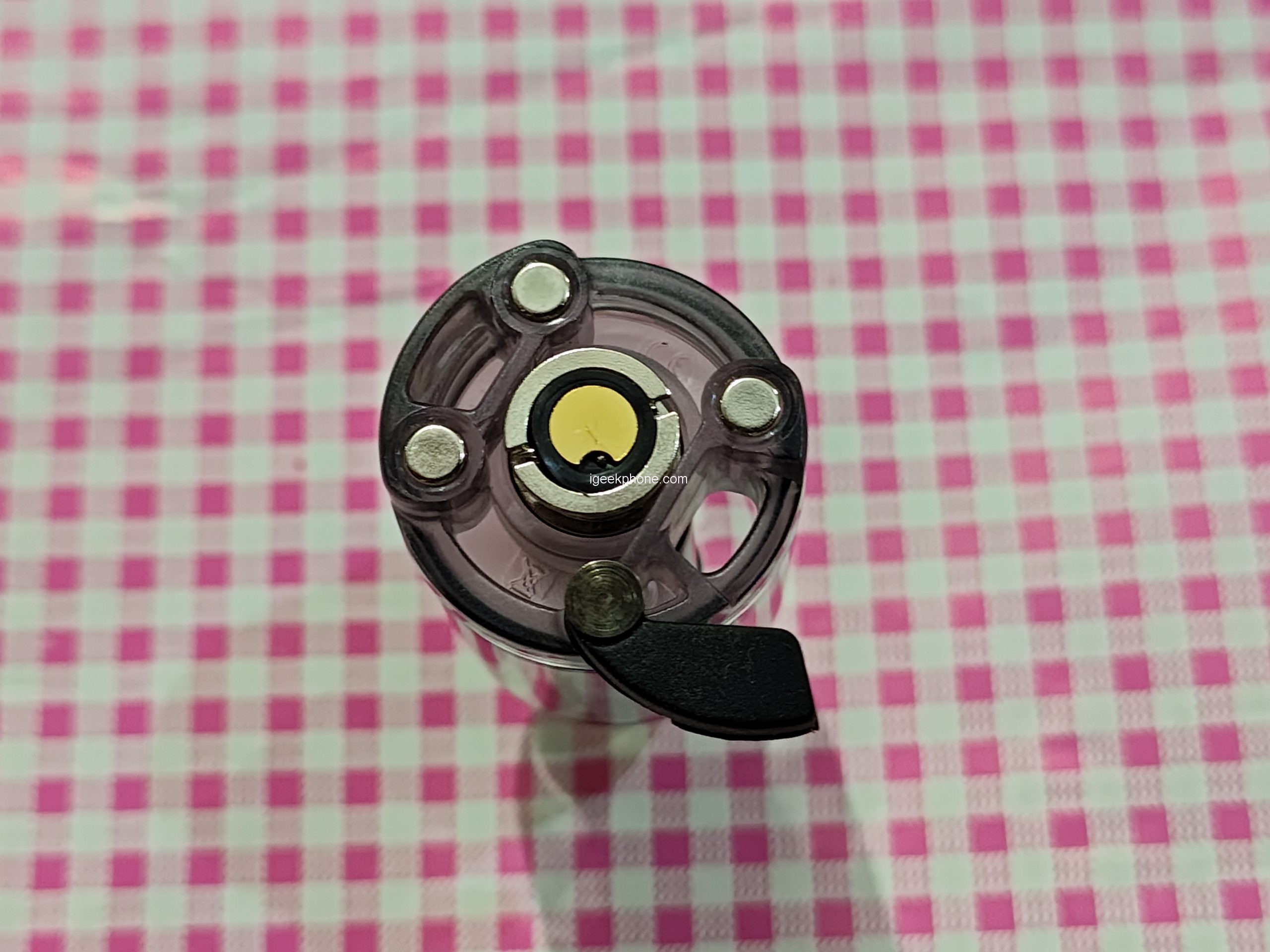 In order to fill the cartridge, you need to remove it from the battery pack; open the silicone plug at the bottom, and pour 4 ml of liquid into the tank.