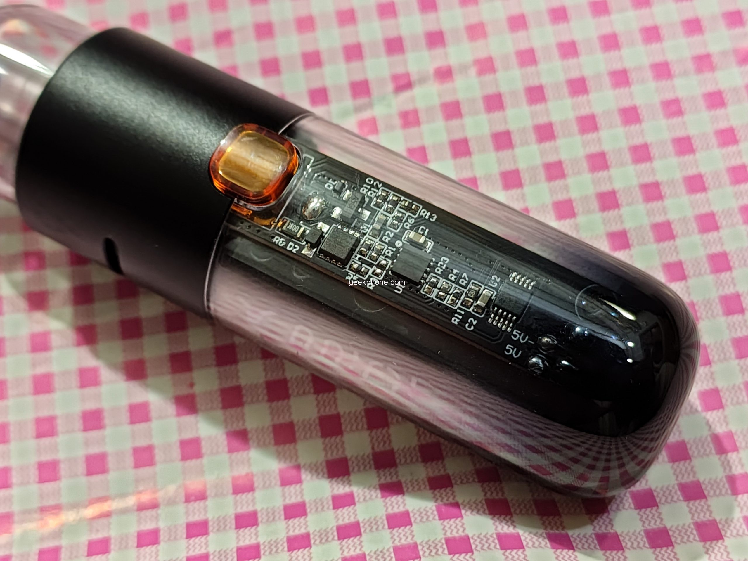 The form factor in which the device is made is quite familiar to vapers – it is a small pipe mod that fits perfectly in your pocket and sits in your hand. Its dimensions are really small – 73.3 * 25.4 mm, and it may seem that it is “plump”, but if you take into account the capacious battery, then everything is logical. The developers decided to make the body of the device from translucent plastic so that the vaper will be able to see the “stuffing” of the device – the printed circuit board and the microcircuits located on it.