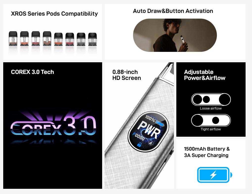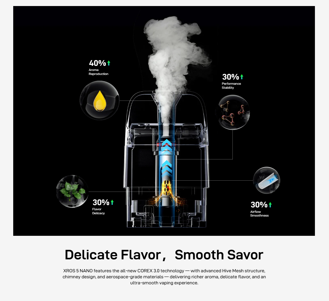 Both devices use COREX 3.0 technology, delivering the same 40% improvement in aroma reproduction and 30% boosts in flavor, stability, and airflow smoothness. They’re compatible with the entire XROS pod lineup (0.4Ω to 1.2Ω options), and both feature adjustable airflow from tight MTL to loose RDL draws.
