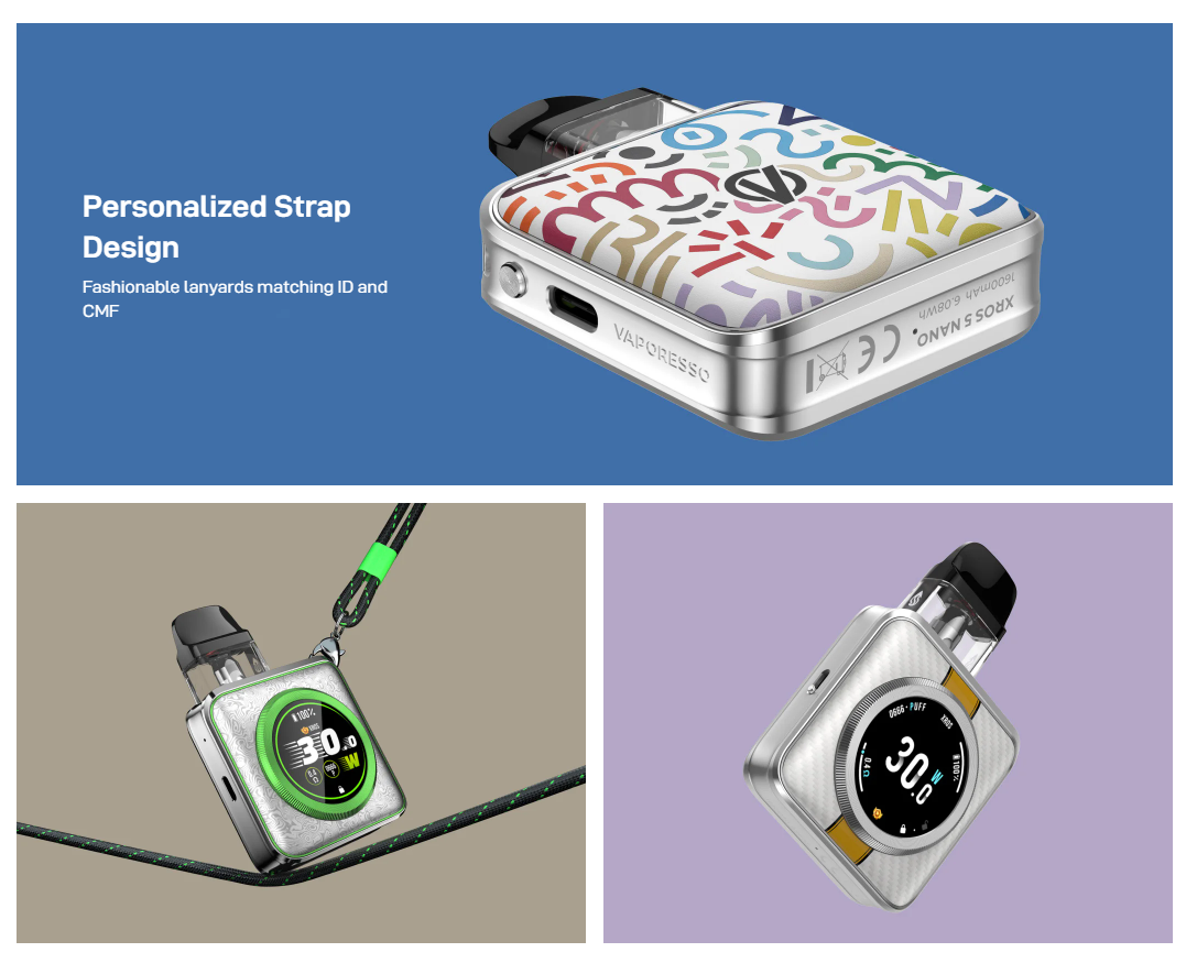 The Vaporesso XROS 5 Nano takes a modern approach with its 1.09-inch touchscreen display and lightweight 86-gram frame. The touch interface feels intuitive, letting you swipe through settings and themes without physical buttons cluttering the design. Vaporesso added a reinforced screen frame for durability and included personalized strap options that match the device’s identity.