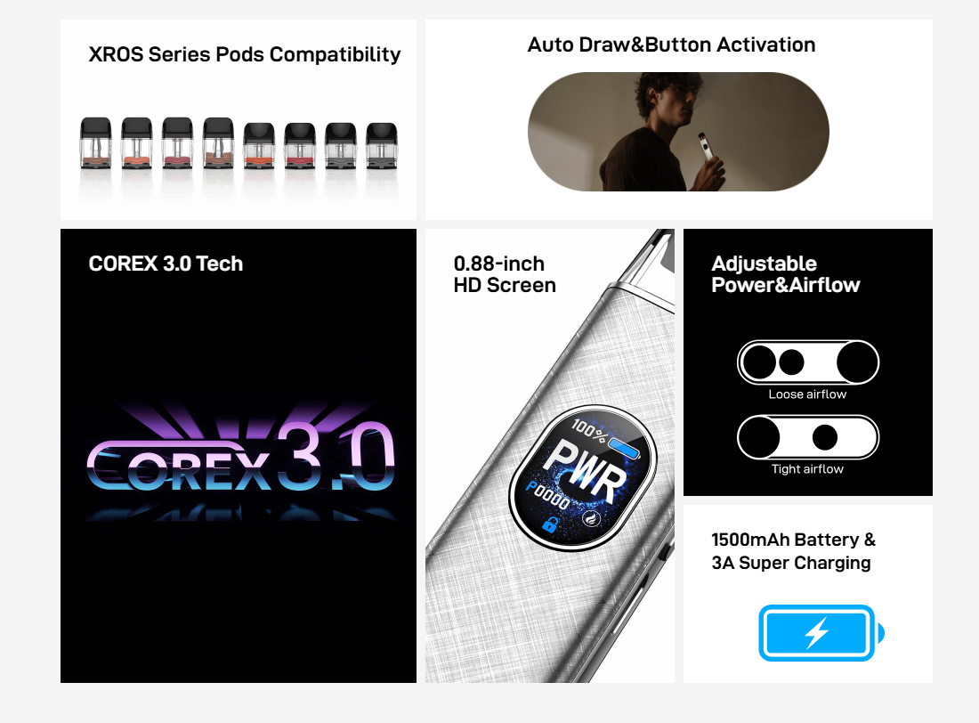 The Vaporesso XROS 5, however, is for those who like control and customization. Powered by a 1500mAh battery with 3A super charging, it charges fast and lasts long. Its COREX 3.0 technology boosts aroma, flavor, and vapor smoothness for a more refined experience. Unlike the ECO ONE PRO, it offers precise power adjustment (up to 30W in 0.5W increments), a sliding airflow switch, and both auto-draw and button activation. The interactive HD screen makes it easier to track settings and adds a touch of fun with multiple theme options.