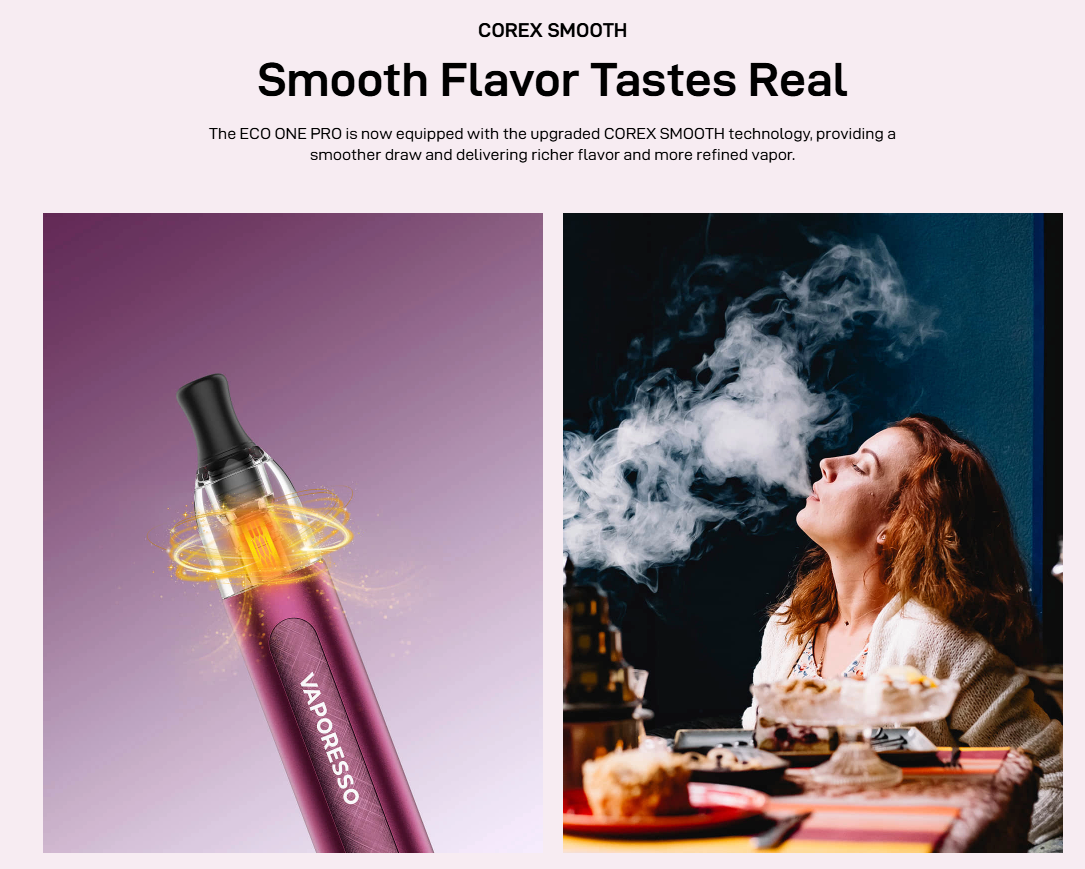 Where the ECO ONE PRO shines is in its simplicity and convenience. It introduces the industry’s first pen-style top-fill design, allowing users to refill without removing the pod—perfect for one-handed use. Backed by COREX SMOOTH technology, it delivers a smoother draw and enhanced flavor. The upgraded filter drip tip lasts longer, resists dirt, and provides a realistic, cigarette-like sensation. With adjustable airflow and compatibility across the ECO ONE series pods, it balances ease of use with versatility.