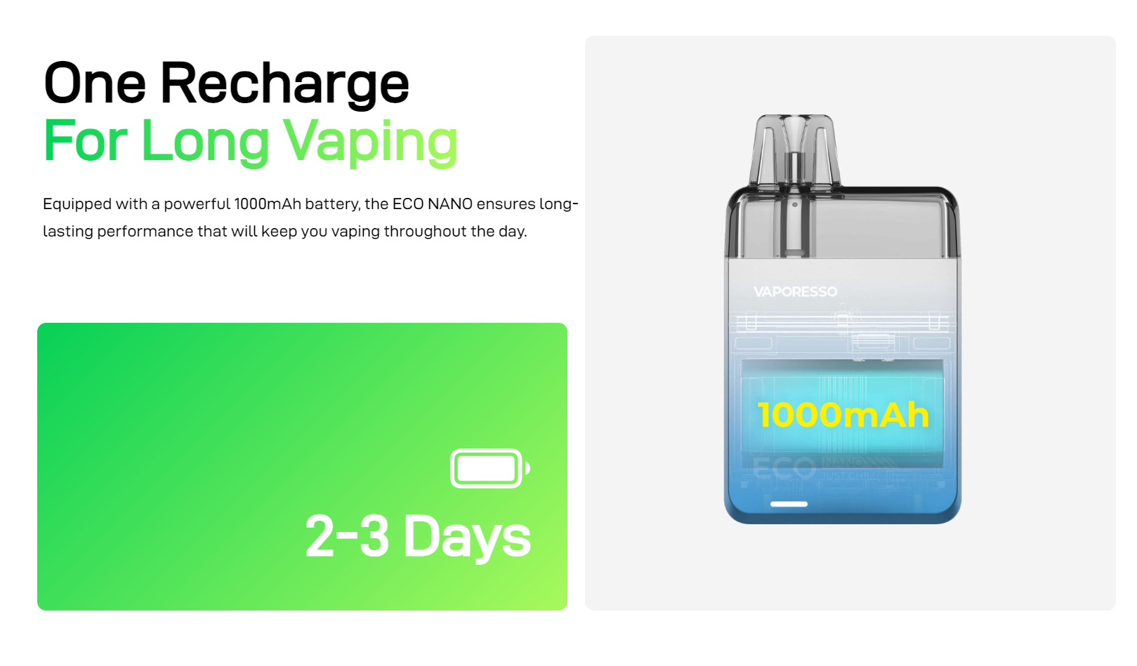 The Vaporesso Eco Nano makes a stride further with a 1000mAh battery, offering adequate power for delayed use. The Sort C, 1A charging port keeps up with proficiency, limiting personal time between charges.