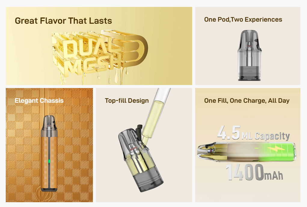 The VIBE SE 2 keeps things refreshingly simple. Its 1,400mAh battery is no slouch either, Vaporesso claims up to 30 hours of runtime in Eco Mode, a 6-hour improvement over the first generation. The dual mesh pod delivers two distinct experiences (ECO and PWR modes) through a single, smooth side slider that also controls airflow. Refilling is easy with the top-fill design, no need to remove the pod. The tri-color LED handles battery status at a glance. It’s all the vaping you need, without anything extra to figure out.