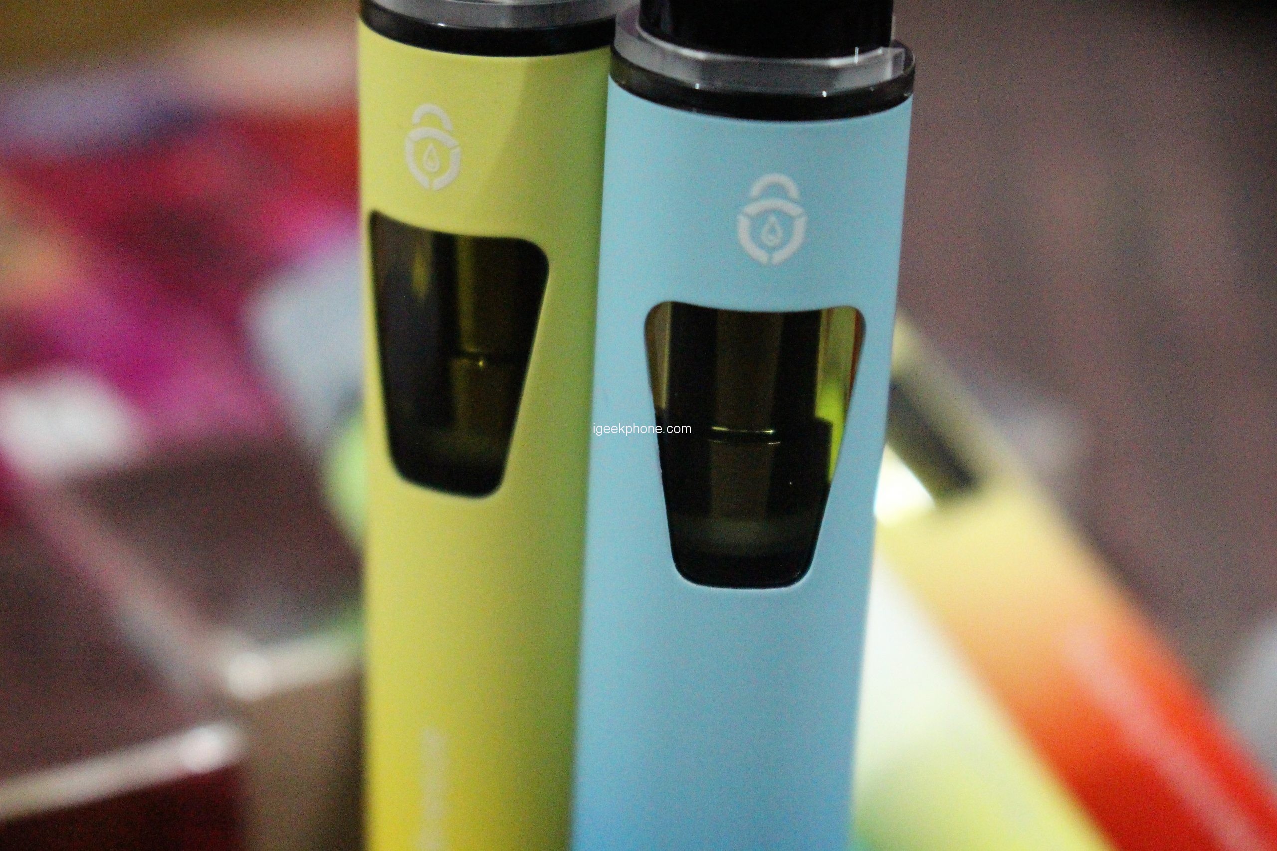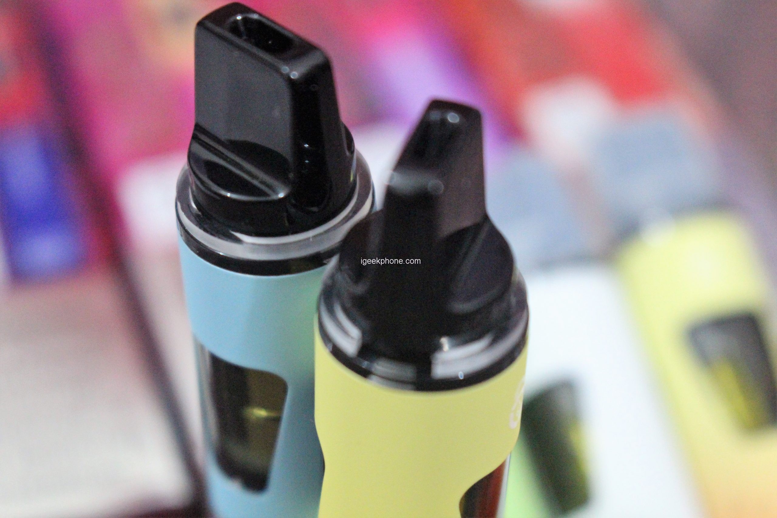 The PICCO is finished with a soft-touch coating that feels great in hand, but can get dirty quickly. The device’s color matches the flavor of the ejuice, with each flavor having its two-tone gradient color. The drip tip of the PICCO is a black plastic rectangle that cannot be removed, and is straight with no slant. While it is not uncomfortable to use, a slanted mouthpiece would have been more comfortable. The bottom of the device has a black plastic base with an airflow inlet hole and a blue LED that lights up each time a puff is taken. The LED can be bright in a dark room but cannot be covered as it affects the draw activation.