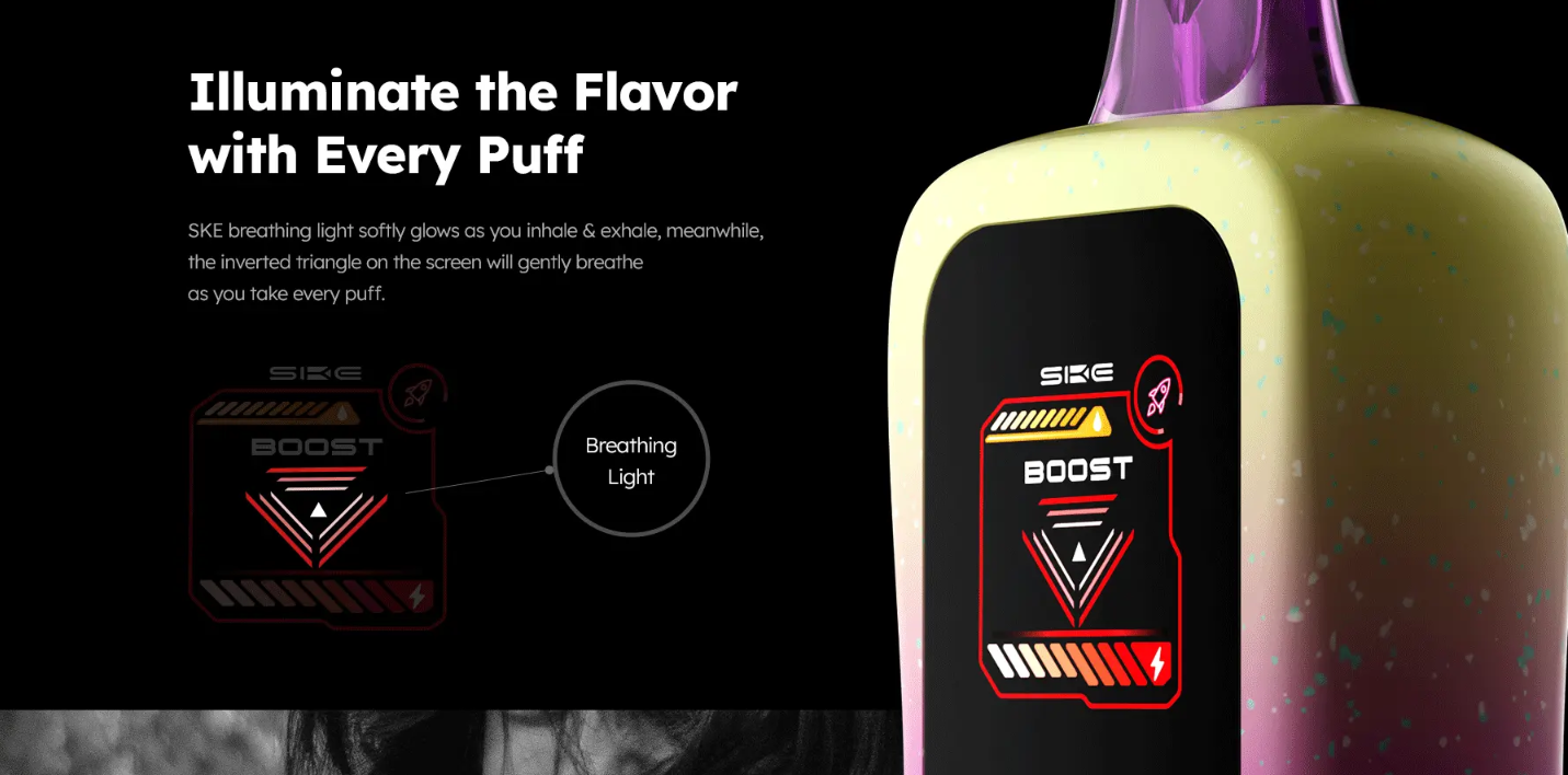 - Three Vaping Modes: One of the standout features of the SKE MG 25000 is its customizable vaping experience. Users can choose between Soft, Normal, and Boost modes, each offering a different intensity level. These modes are indicated with unique colors and themes on the touch screen, adding a fun and interactive element to the device.