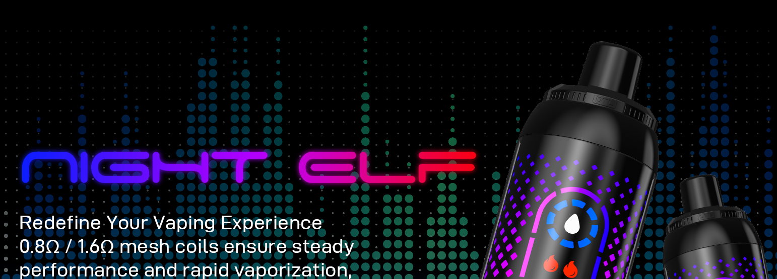- Dual Mesh Coil System: The Night ELF is equipped with a dual mesh coil setup (0.8Ω/1.6Ω), which enhances flavor and vapor production. Mesh coils are known for their efficient heating, which leads to better flavor and more consistent performance over time.