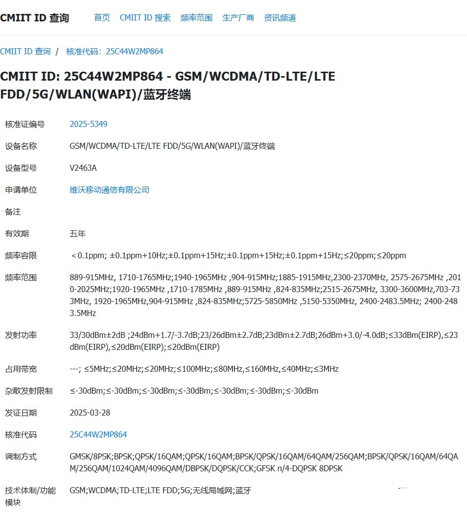According to the information in the GSMA IMEI database, the model V2463A mobile phone will be named iQOO Neo 10S after its market launch. According to the information on the 3C certification page, it shows that this phone is equipped with V12060L1H3-CN, V12060L1H2-CN, and V12060L1A3-CN chargers. Supports 120W fast charging.