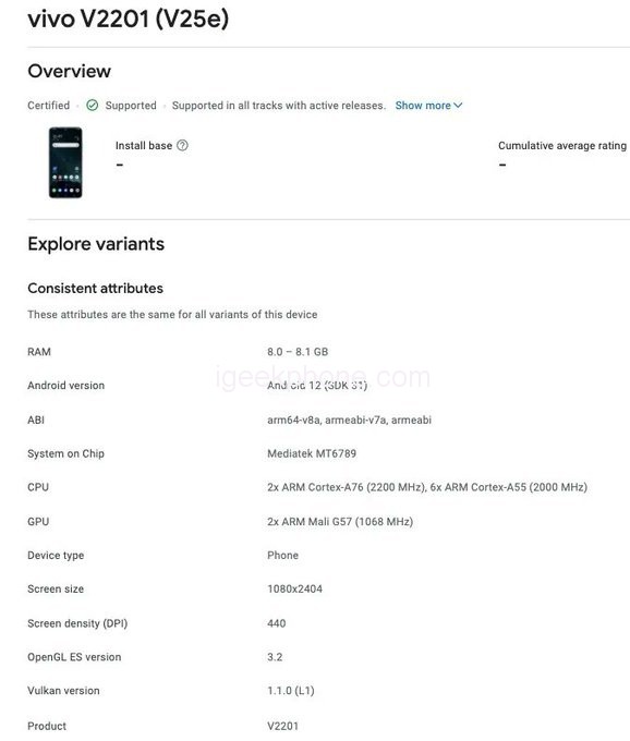 The Google Play listing includes vivo phones with model numbers V2201 and “V25e”. vivo V25e is equipped with a MediaTek Helio G99 chip and a built-in Mali G57 GPU. Has 8GB of RAM, but may also have a 4GB RAM version.